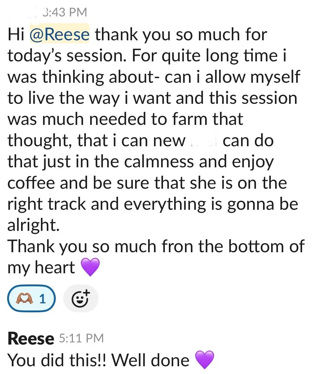 No more spinning your wheels. You’ll leave each session with clear, actionable steps that feel good and keep you moving forward.