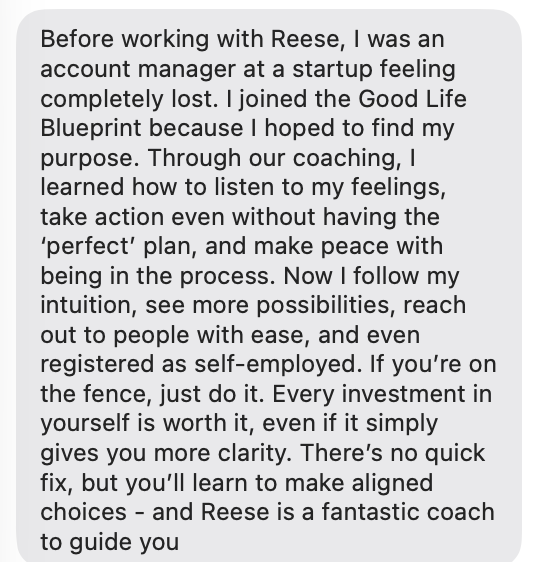 Good Life Blueprint is my 12-week 1:1 coaching program designed to help ambitious women get crystal-clear on what they actually want in life – and build a plan that feels aligned, grounded and doable.